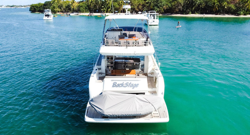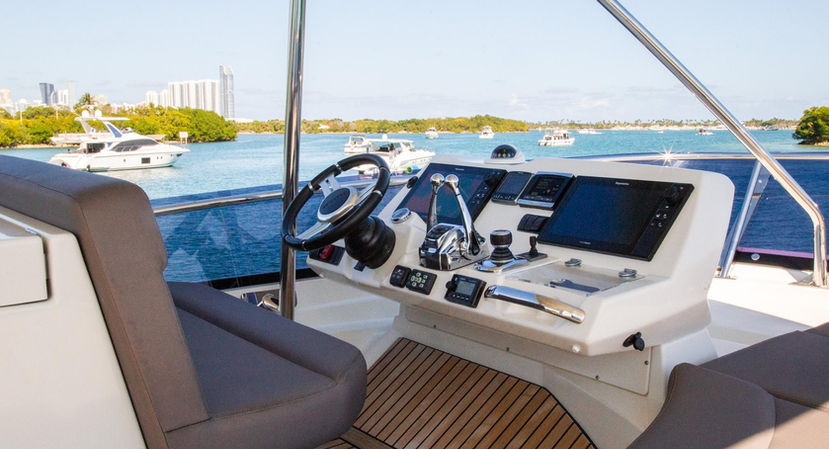Expansive Flybridge: Command the helm with companion seating, host gatherings at the U-shaped dining area, or relax on the sunpad alongside a fully equipped wet bar (sink, refrigerator, grill).